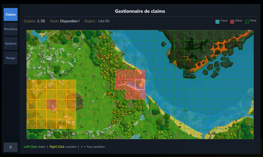 Les claims fonctionnent par chunk. Au début, tu possèdes un seul chunk et tu en débloques un nouveau chaque heure de jeu sur le serveur.
